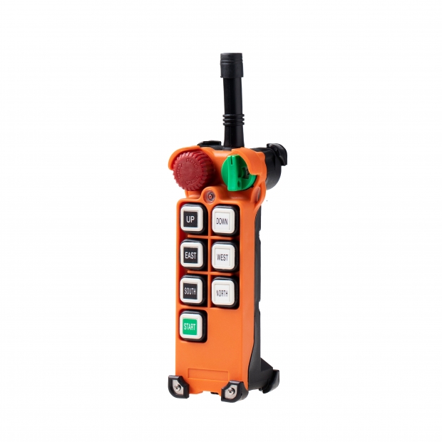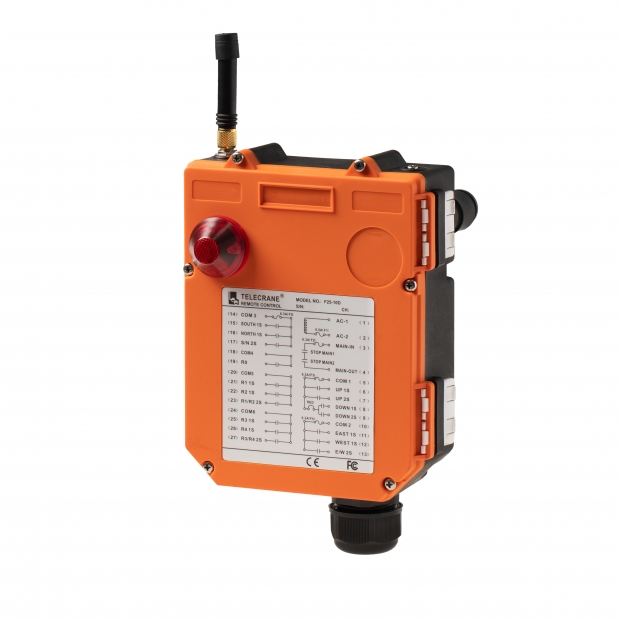F25-6S ( 6 Pushbuttons single speed) F25-6D ( 6 Pushbuttons double speeds) Emergency of STOP control comply with EN ISO 13849-1 (PL=d) Durable casing with extra shock resistance Programmable function setting, optimum flexibility for all kind industrial applications Remote Pairing technology, allowing instant maintenance on site Pre-wiring standard cable for quick and easy installation Built-in receiver Alarm/Horn, save the cost of installing extra warning devices Transmitter Dimension: 186 x 61 x 51 mm Weight: 250 g (w/o batteries) Power: 4 AA batteries, Alkaline / rechargable acceptable Receiver Dimension: 200 x 162 x 107 mm Weight: 1550 g (w/o wire cable) Power Supply: 24/48/110/220/380 VAC / 12~24 VDC